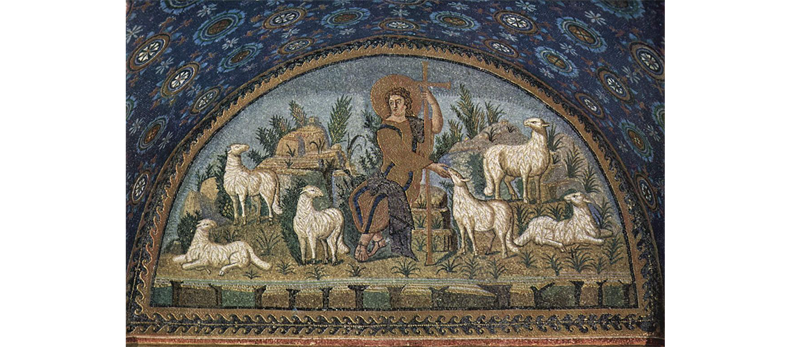 El mosaico de un buen pastor situado en el interior del tímpano de entrada del Mausoleo de Gala Placidia en Ravena, muestra la influencia del naturalismo idealista del arte romano en las representaciones cristinas de entonces. Fue realizado entre los años 425 y 436, cuando el Imperio Romano apenas comenzaba a separarse en dos culturas diferenciadas.